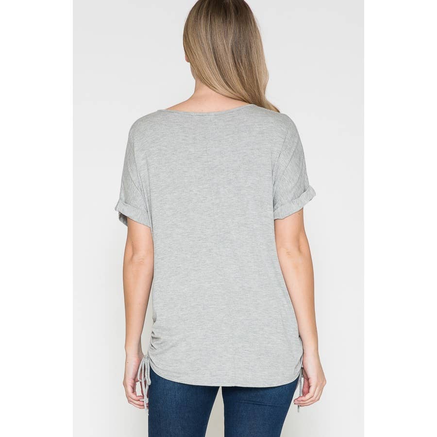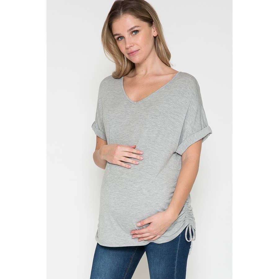 This Side Shirring V-Neck Top is the perfect blend of style and comfort. With short, roll dolman sleeves, and drawstring ruched sides, it's both chic and cozy. The v-neckline adds a touch of femininity to this top, making it a must-have for any wardrobe. Stay comfy and stylish with this unique piece!
